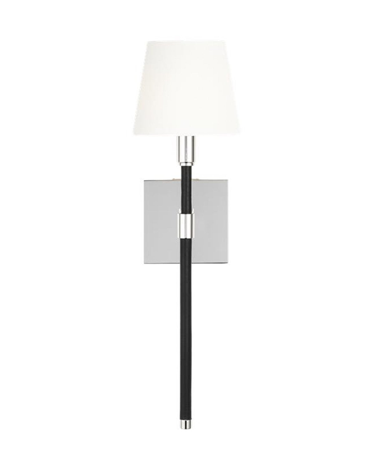 Simple and sophisticated, mixed materials add a refined update to the streamlined shape of our Danica Single Wall Sconce. With a base finished in either a time worn brass or polished nickel, leather details in a rich cognac or solid black accent the classic silhouette, bringing light to those hard to reach spaces.