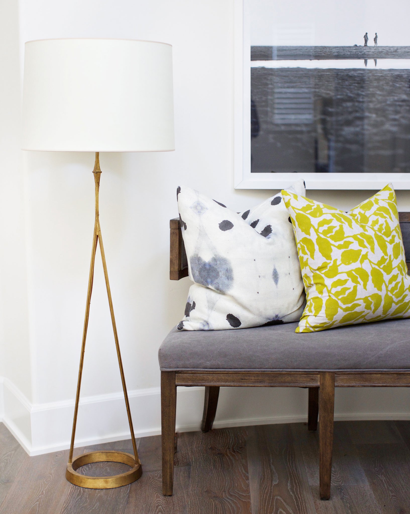 We absolutely love this floor lamp! The circular base and gilded iron finish is perfectly feminine and works great next to an accent chair.