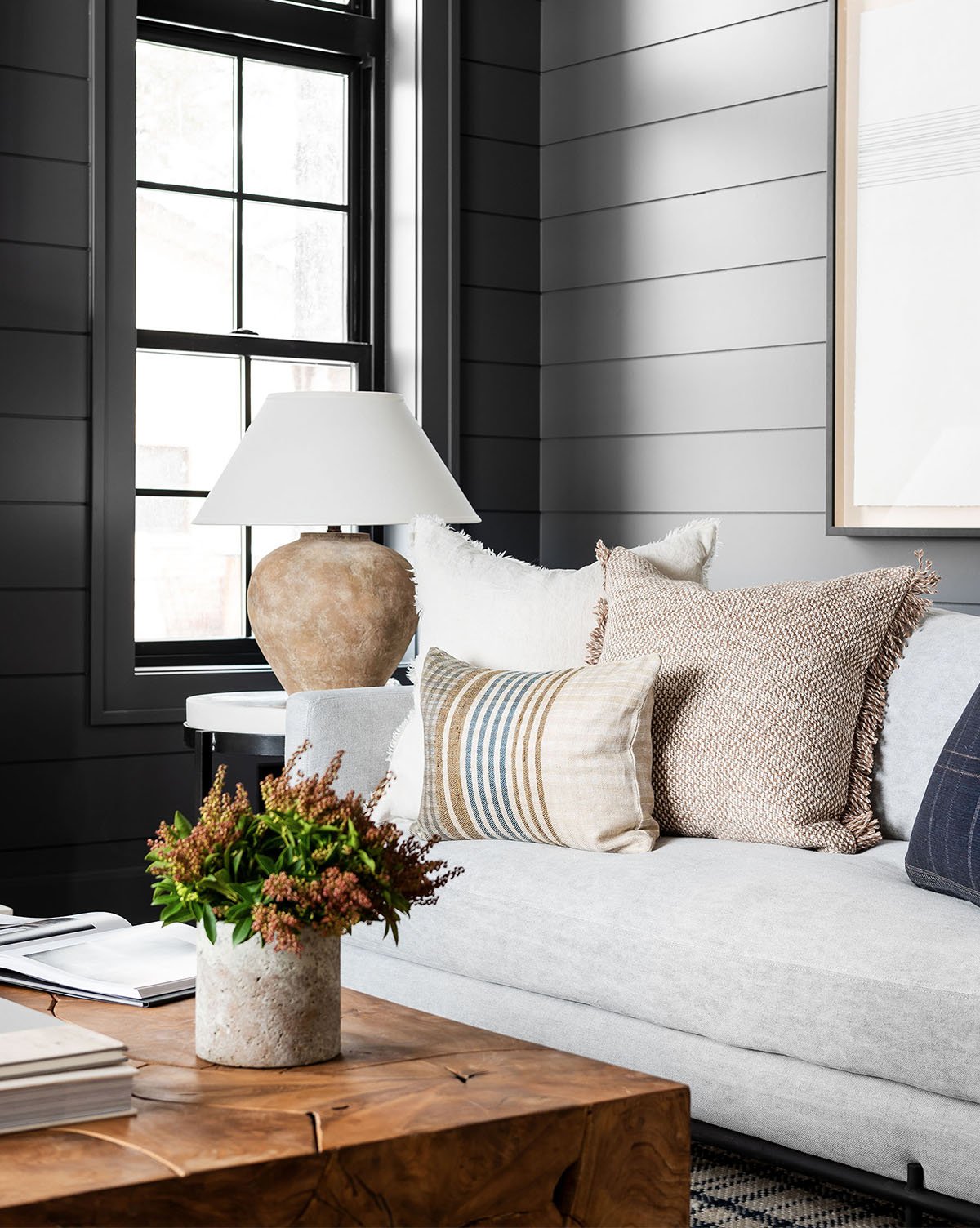 With a shapely base, and plenty of earthy, aged texture, our Decker Table Lamp brings a found look and feel to existing design. Styled on a side table, its contrasting white fabric shade softens the rustic form, divulging a comfortable layer of light into your space.