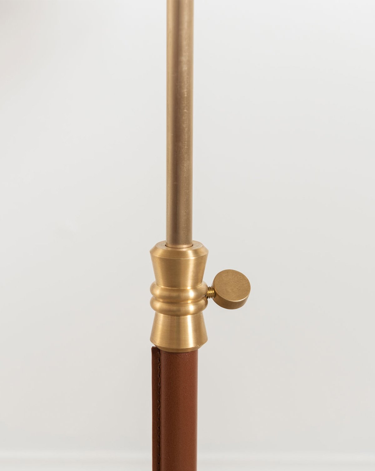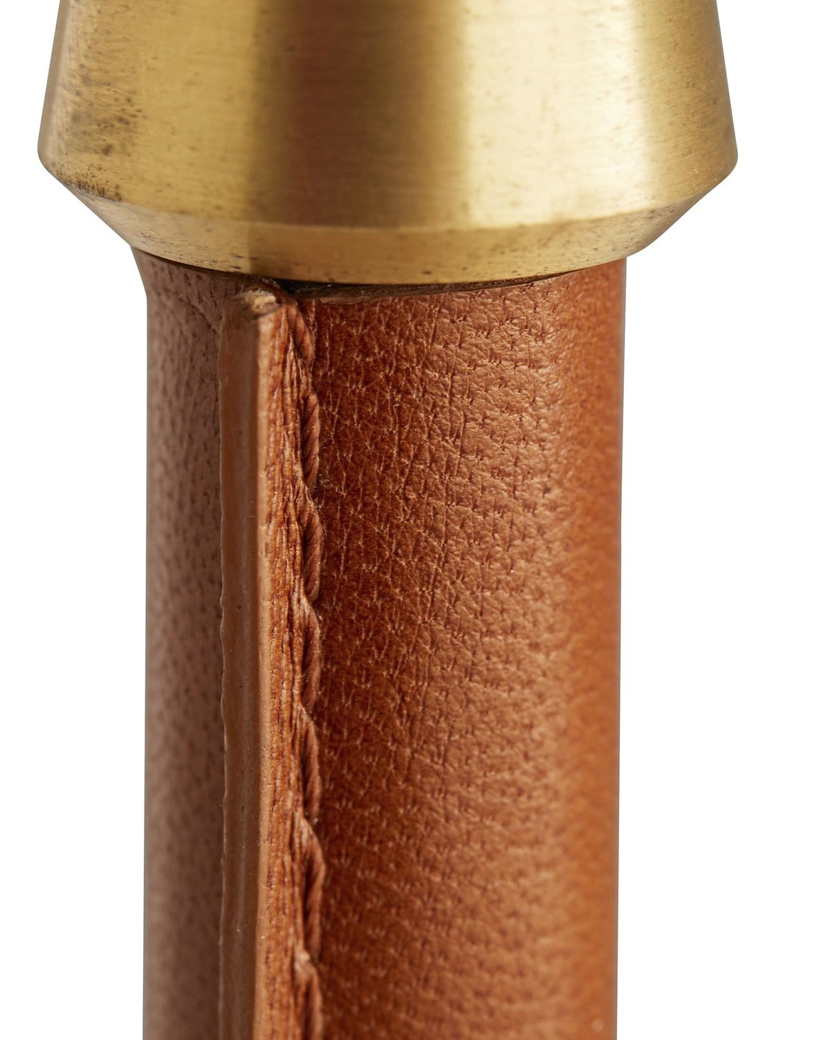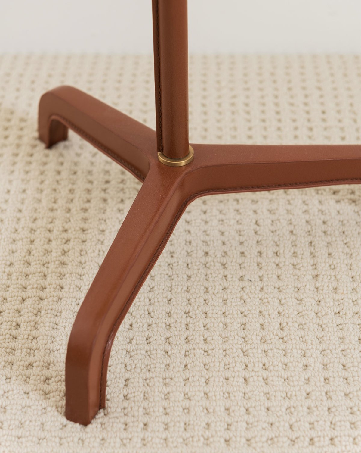 Beauty is evident in the form and details of the Emma Side Table.  Both the top and adjustable stem are made of brass, but finished in brushed and antiqued gold respectively.   Wrapped in cognac leather with exposed stitching, the base proves its craftsmanship quality.