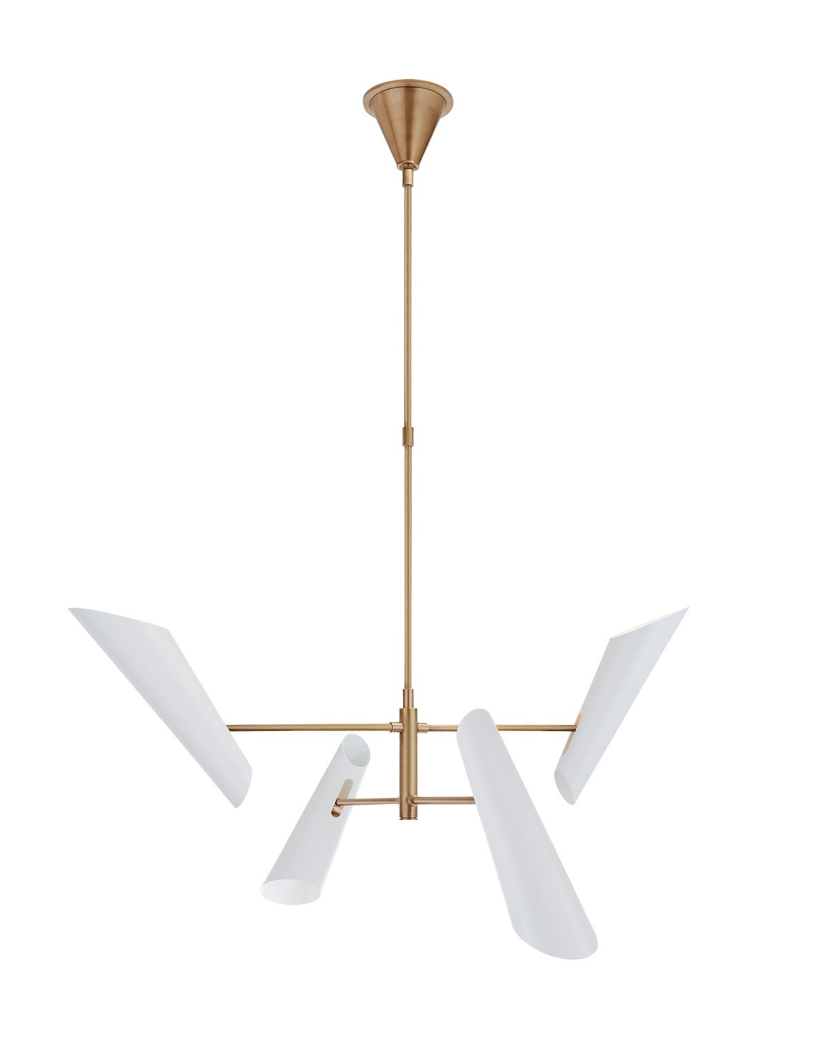 Make a statement in your entry with the four shade form of the Franca Pivoting Chandelier. Angular and modern, this fixture elevates your space while adding an abundance of light. Featuring either black or white shades, hand-rubbed antique brass accents liven up your existing design with a refined, mid-century feel.