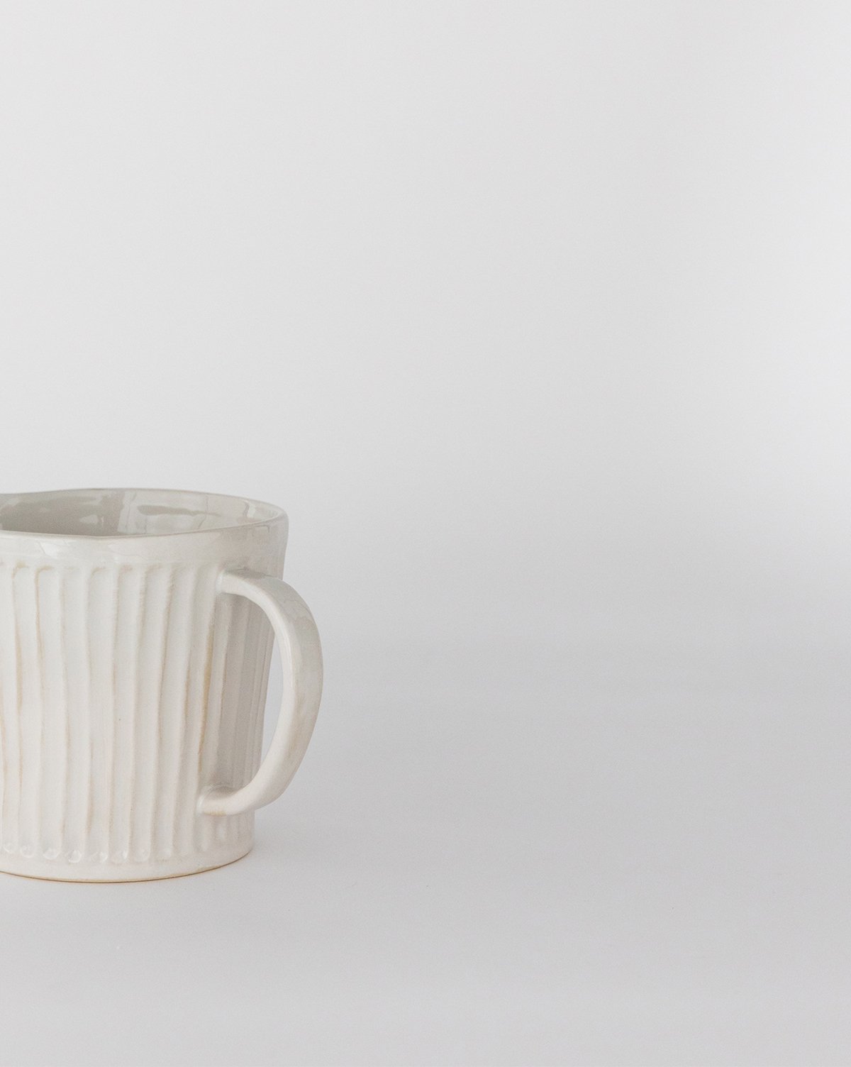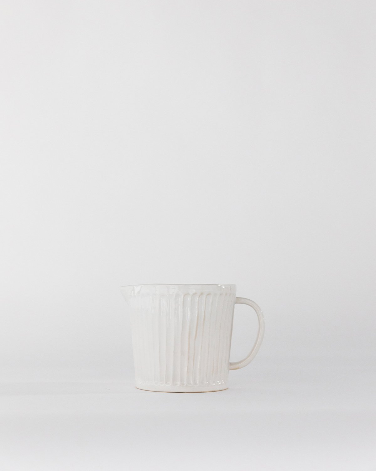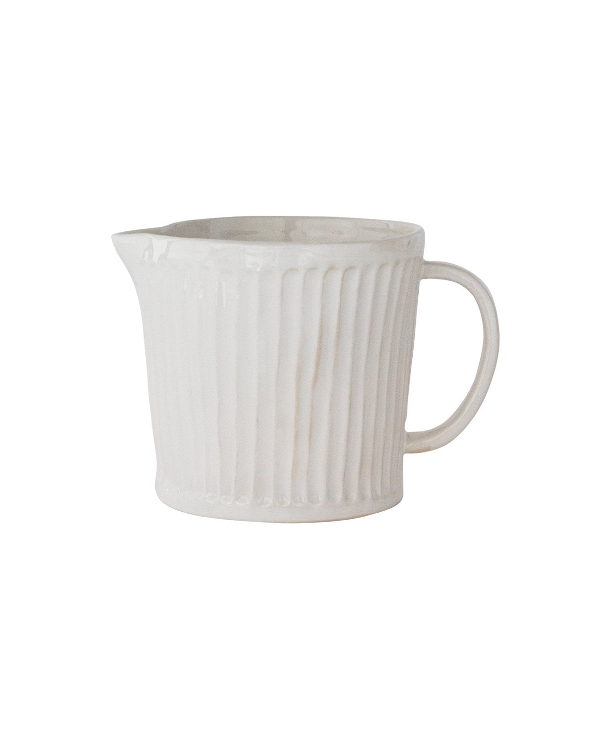 The organic texture of our Glossy White Scalloped Pitcher is designed to elevate your existing tablescape with ease. Its simple form is crafted with hand-applied imperfect ridges, bringing character and style to all your entertaining needs.