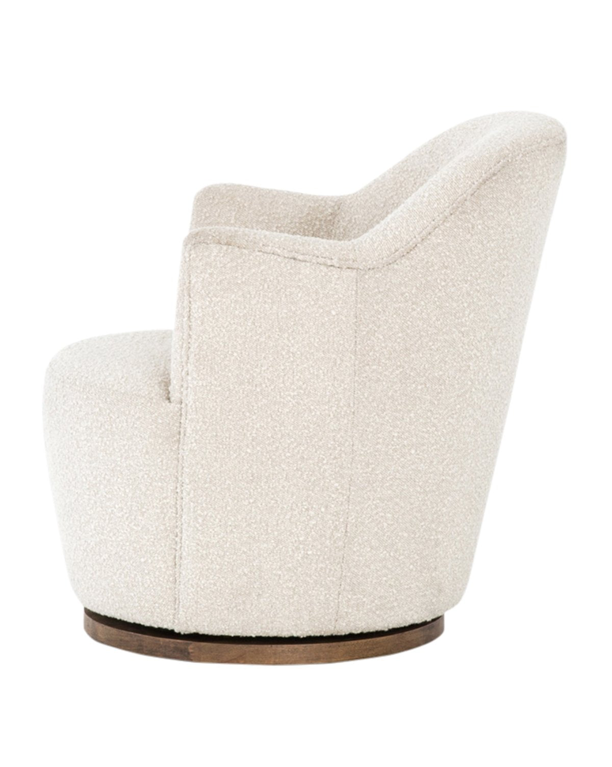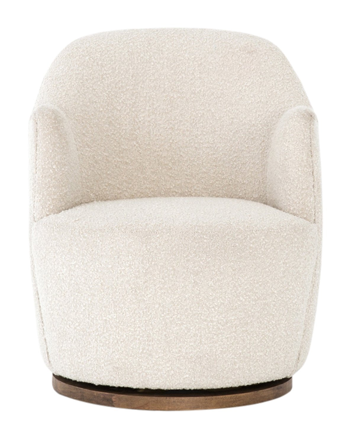 More modern and feminine than most of our chairs, our Gulliver Swivel Chair brings more than one unexpected element to your living room or bedroom design. Its drum style seat is upholstered in a textural boucle fabric, while a natural parawood base gives just the right amount of warmth to this contemporary, swiveling design.