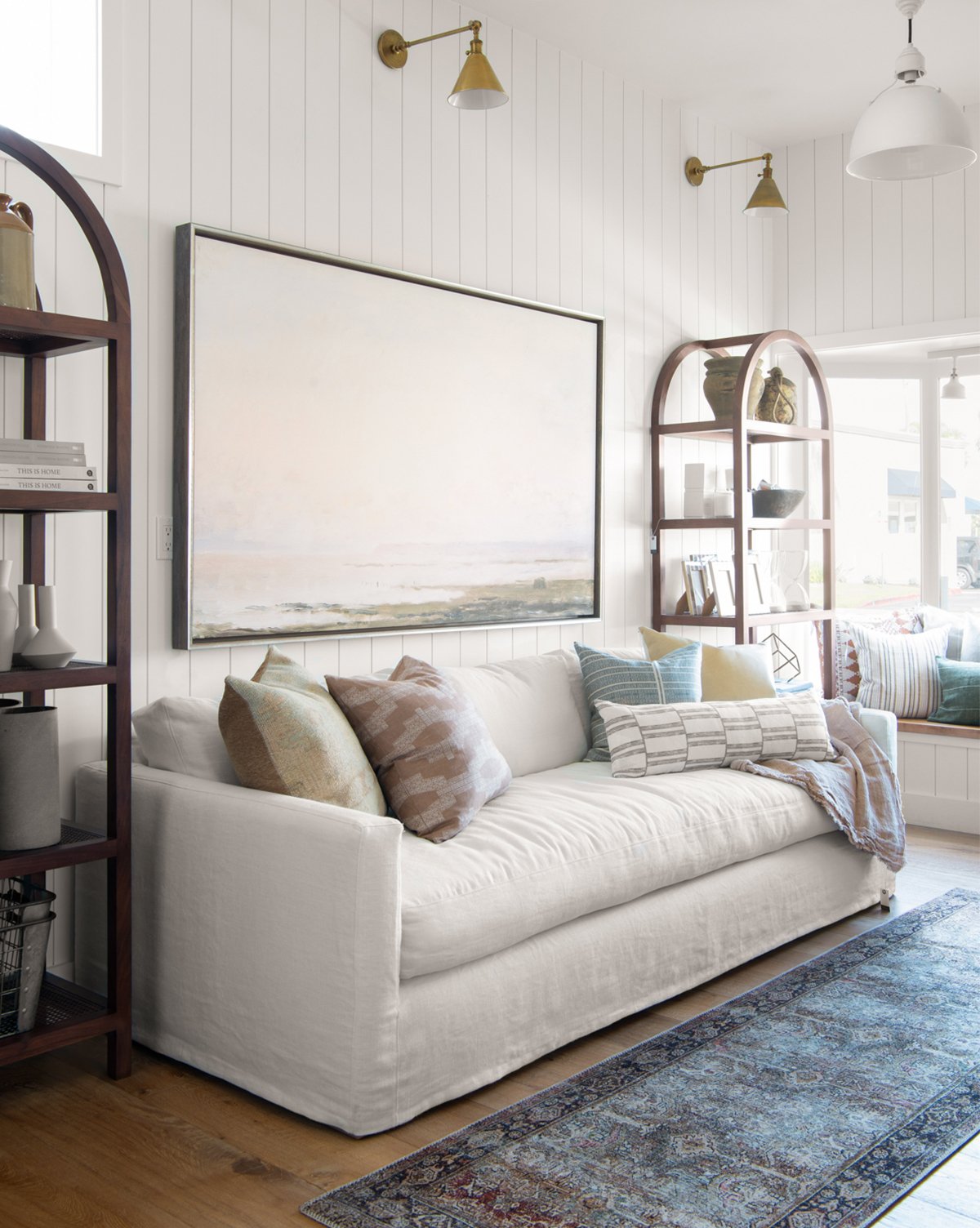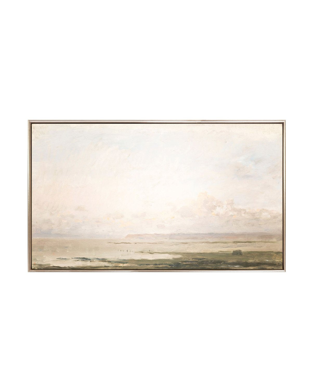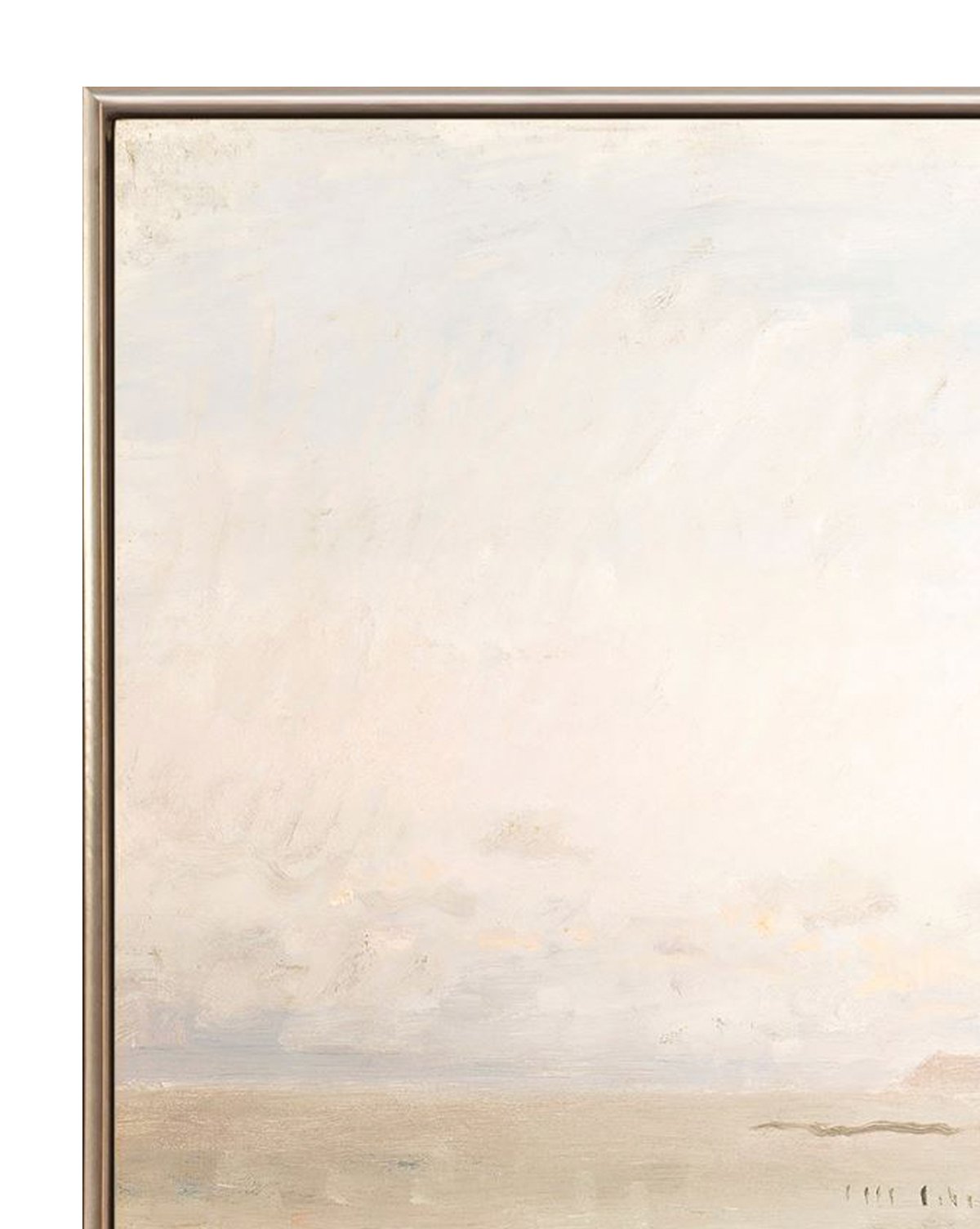 Soft brushstrokes of blush and olive create the serene scene of our Hazy Beach piece. Quintessential clouds in the distance play with depth and dimension through a masterful use of color.