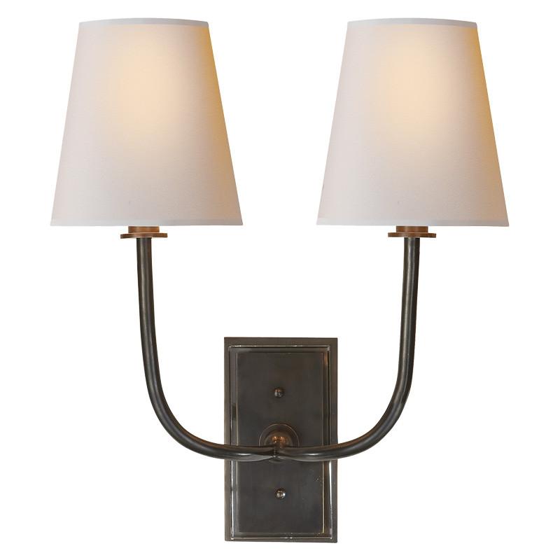 We love the casual elegance of this double sconce. It's graceful curves form arms holding natural paper shades that give off a soft glow.