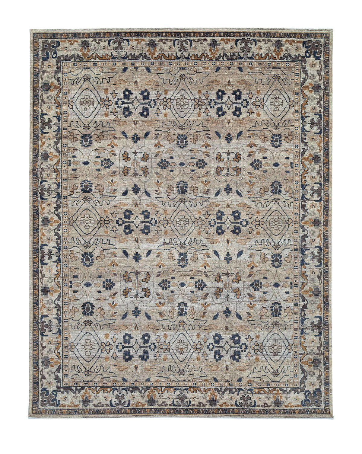 Hand-knotted by skilled artisans with a keen attention to detail, the Kasuri Rug adds visual interest to your space with its unique color palette. From the deep blues to golden hues and tonal background, this rug is crafted from 100% wool anchoring your room with a comfortable, luxurious feel.