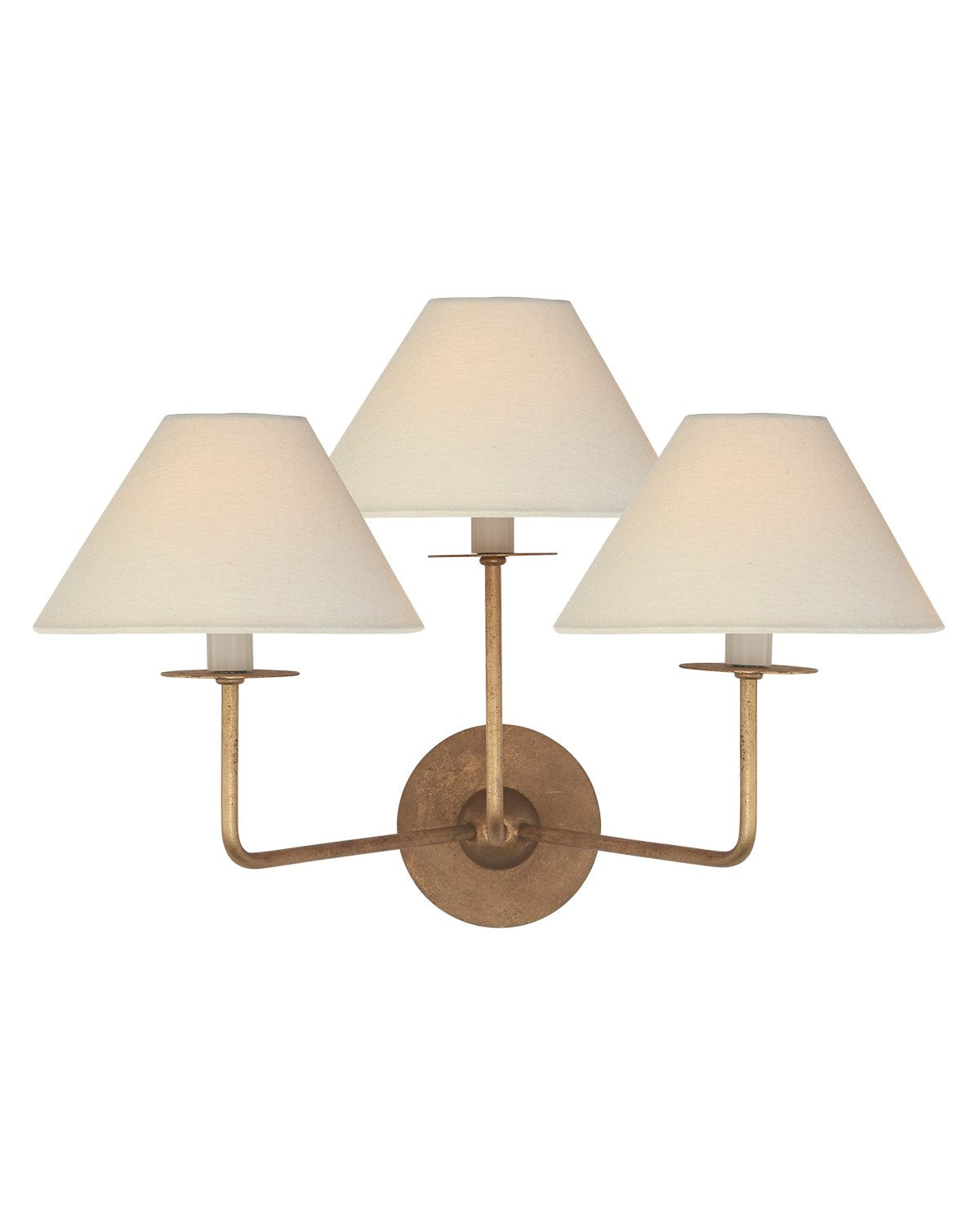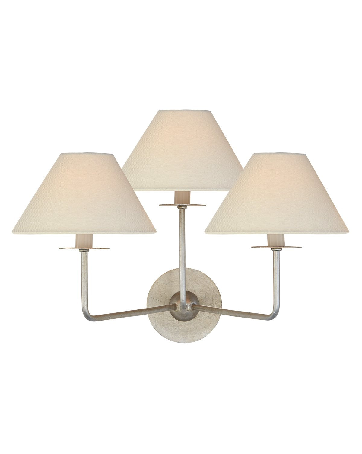 The Kelly Triple Sconce shows its mastery of mixing modern and traditional with the uncommon curved angle of its three arms. Incredibly balanced, this transitional piece provides balance in both style and light throughout the room.