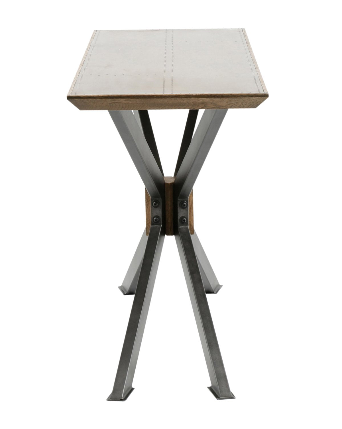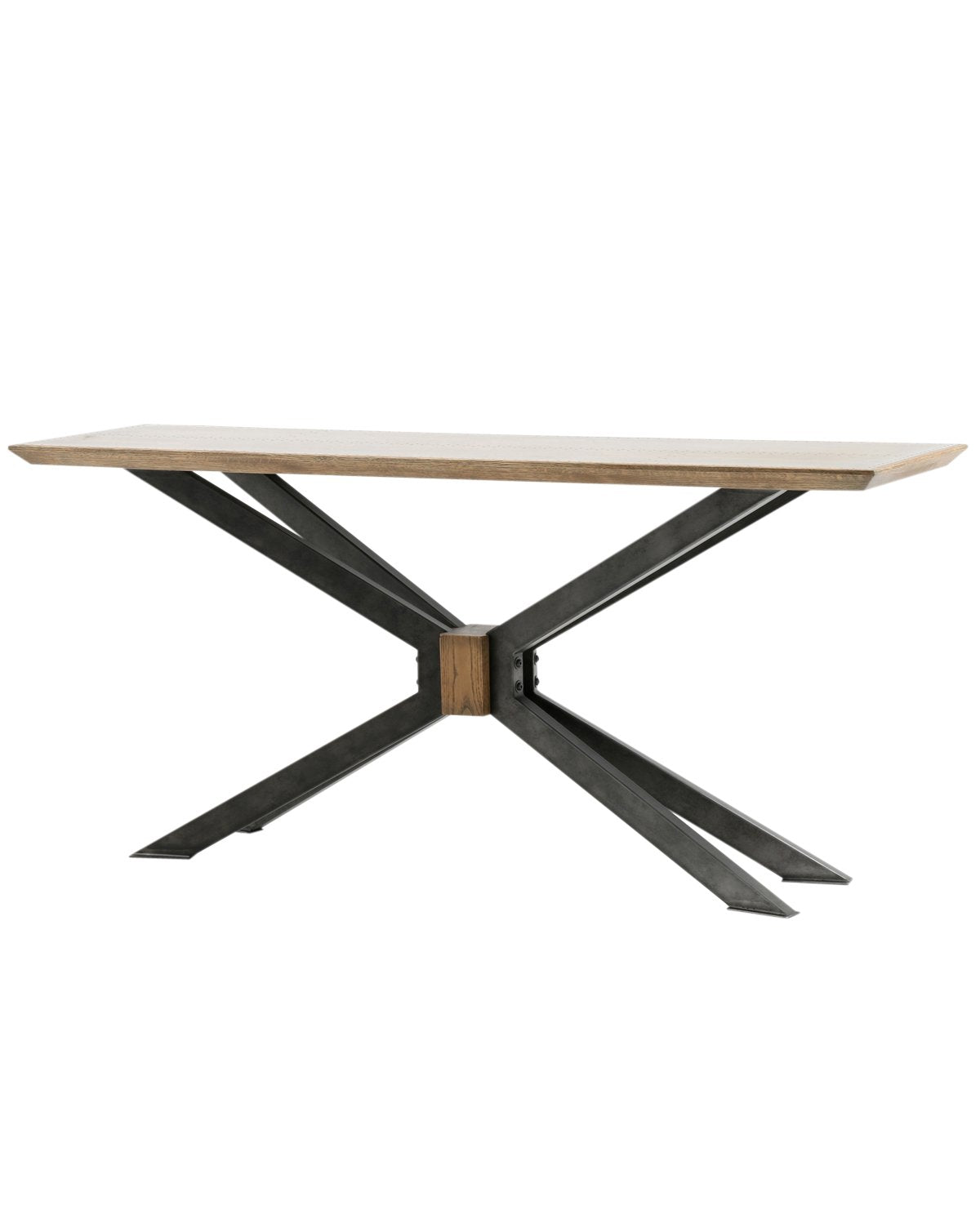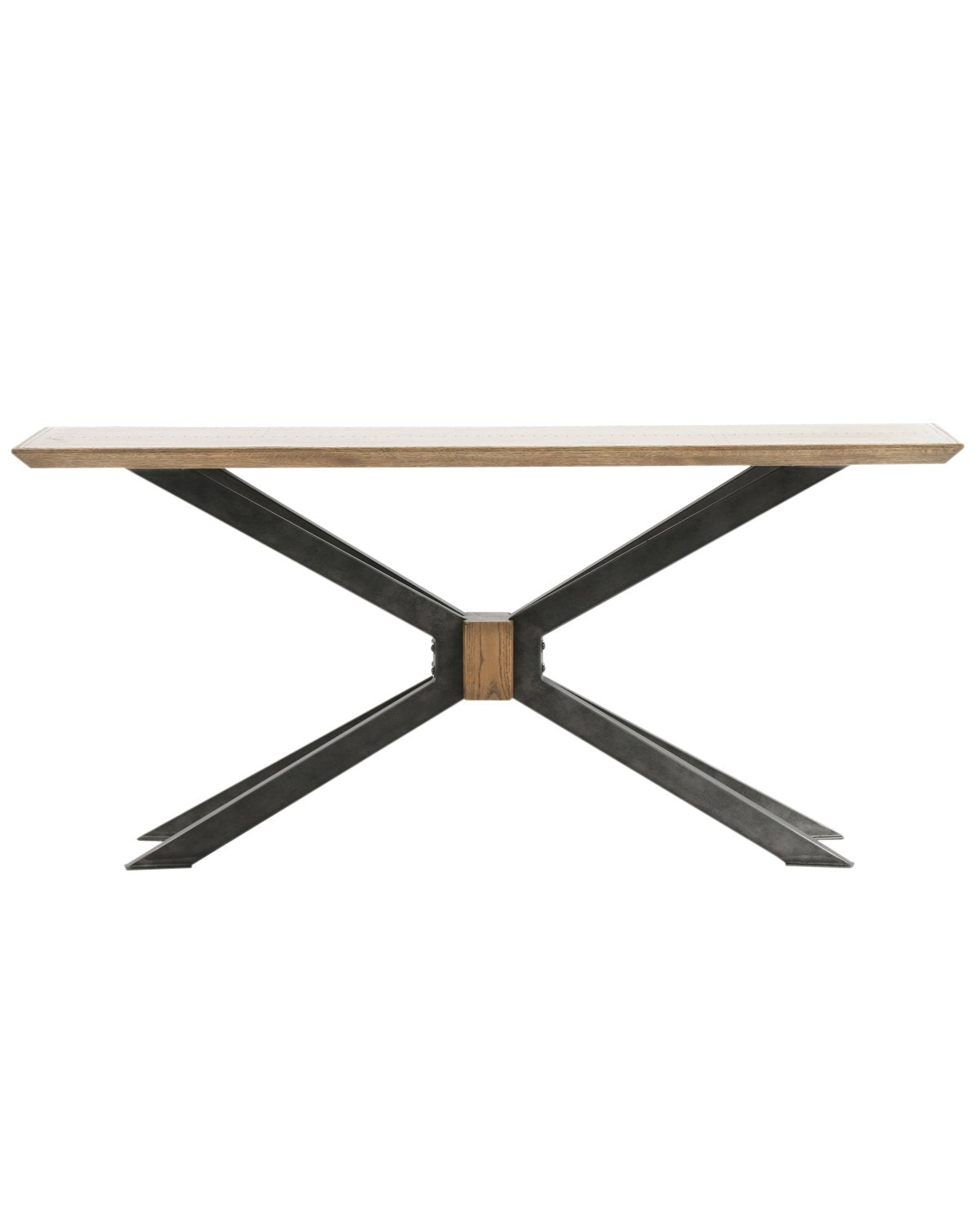 The Lachlan Console Table is rich with architectural interest and material quality. Its woodblock center grounds its dramatically angled black iron supports, while its brass clad top enhances its unique material mix.