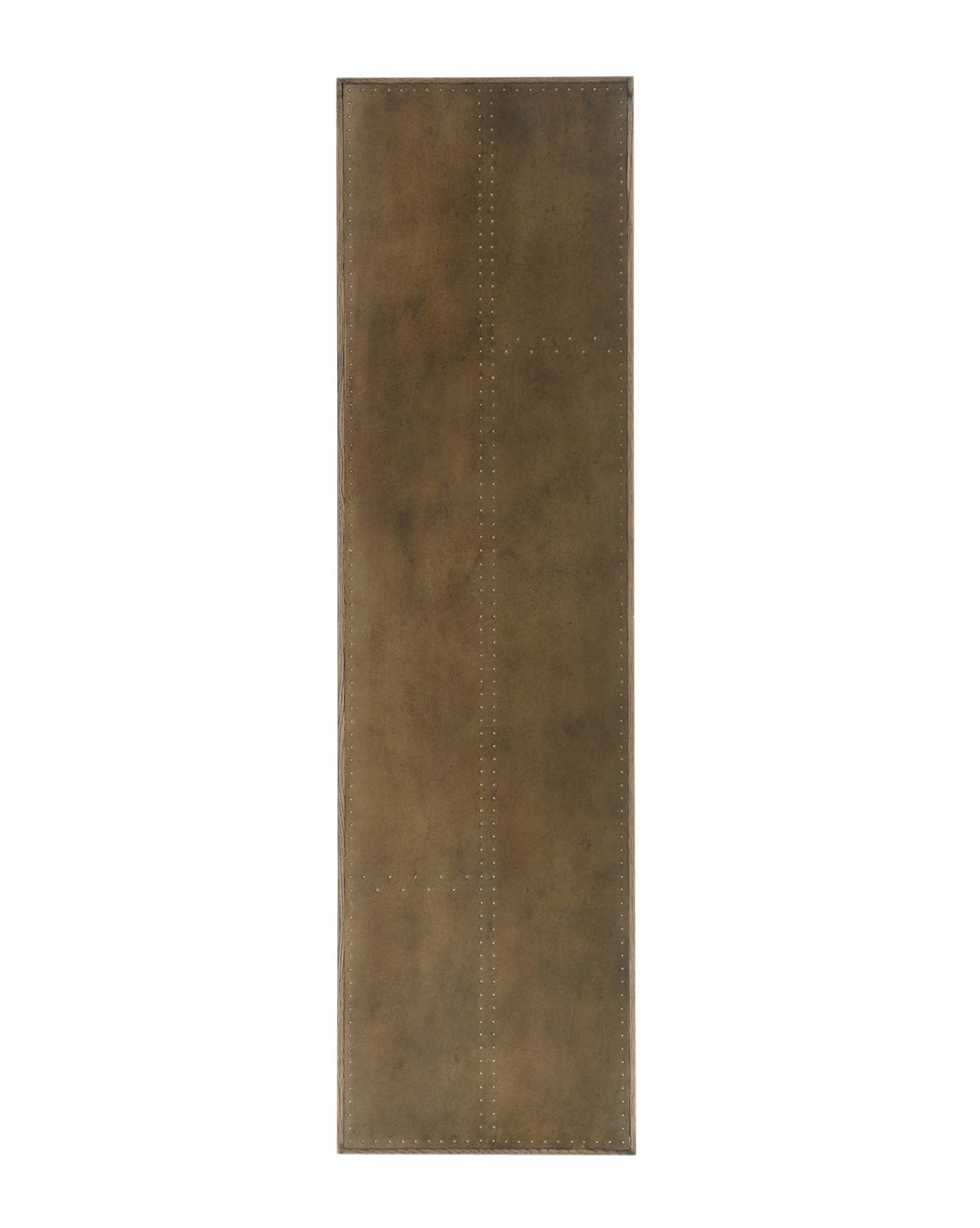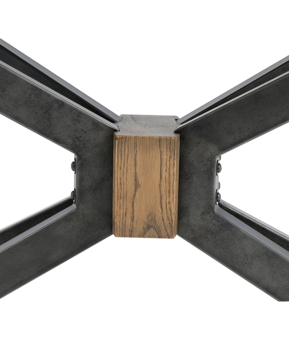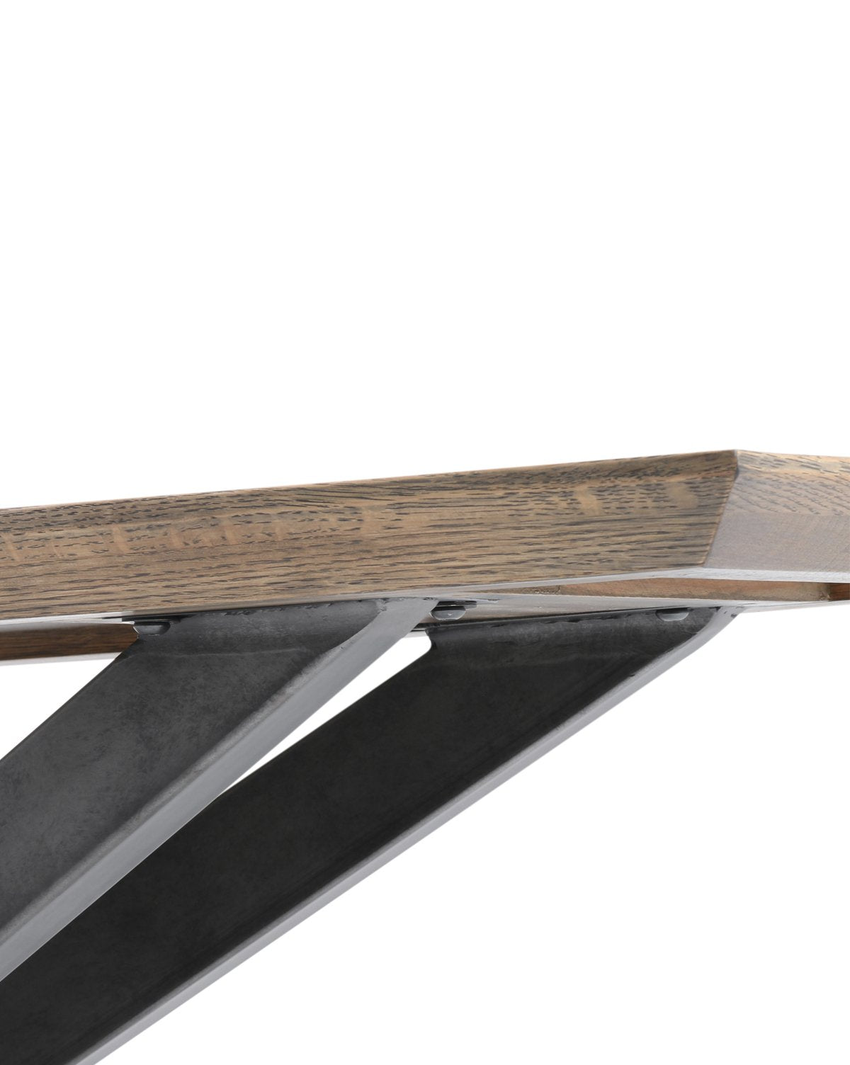 The Lachlan Console Table is rich with architectural interest and material quality. Its woodblock center grounds its dramatically angled black iron supports, while its brass clad top enhances its unique material mix.