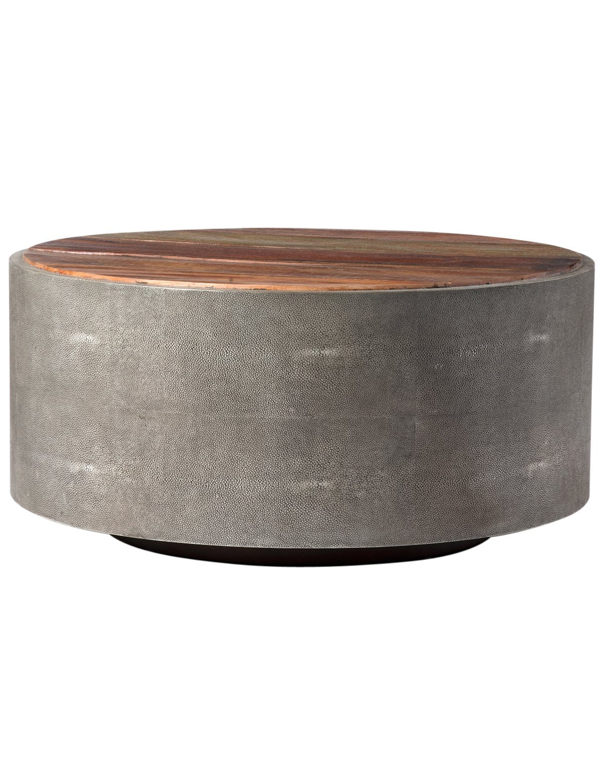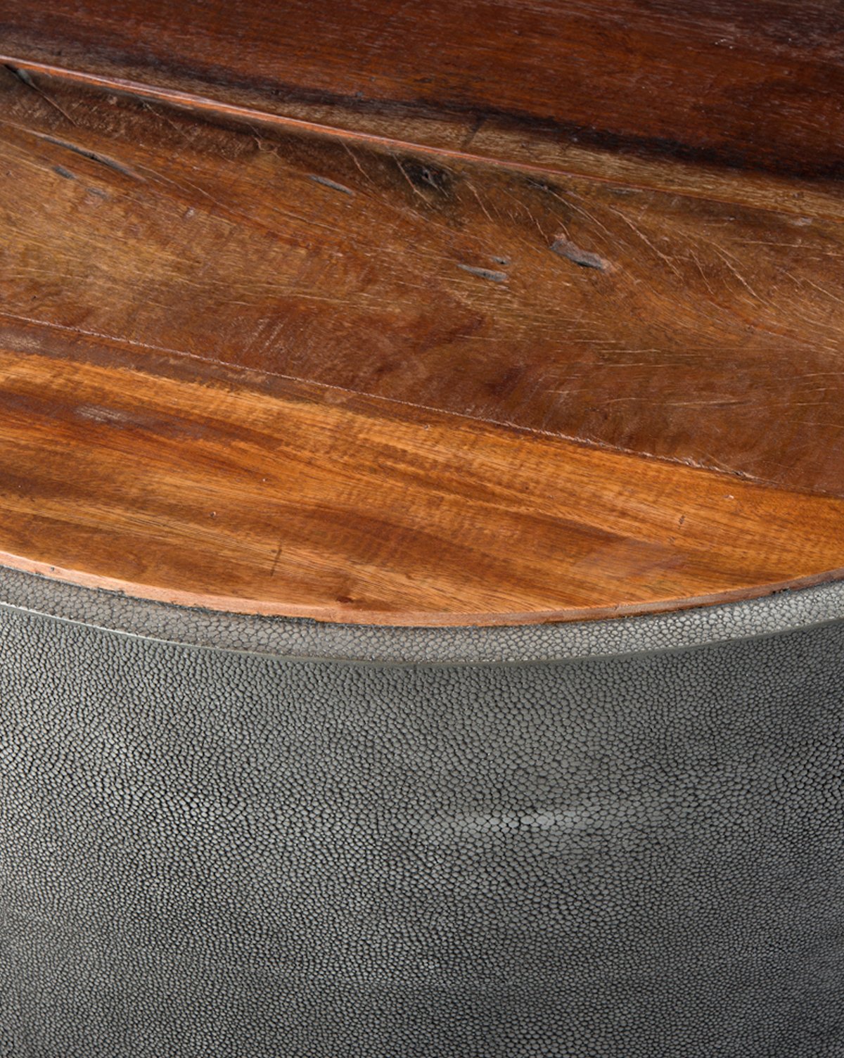 Mixing materials is one of the best ways to up your designs, we love the drama this coffee table brings with its reclaimed peroba wood top and textural gray faux shagreen base.