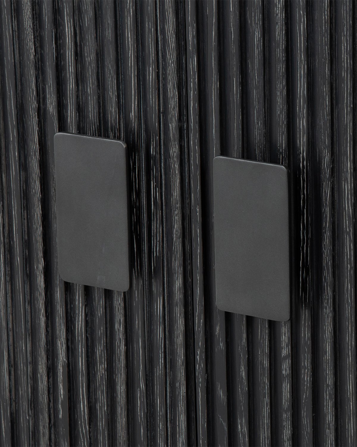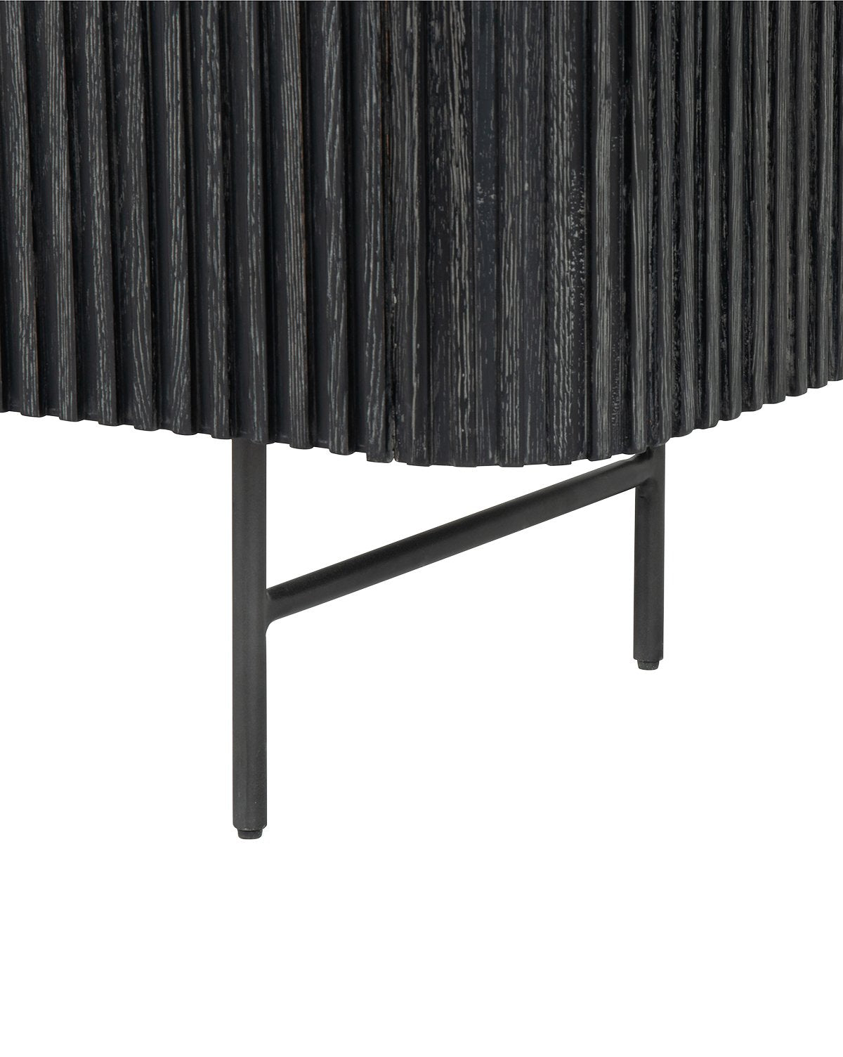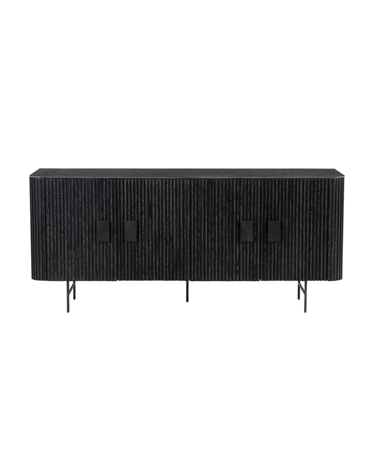 With a deep hue and eclectic vertical reeding, the Lola Sideboard brings clean mid-century modern design to your space. Crafted from black oak and whitewashed for added dimension, its contemporary frame is finished with a masterful mix of materials from the slim iron legs to the sophisticated blue stone top.