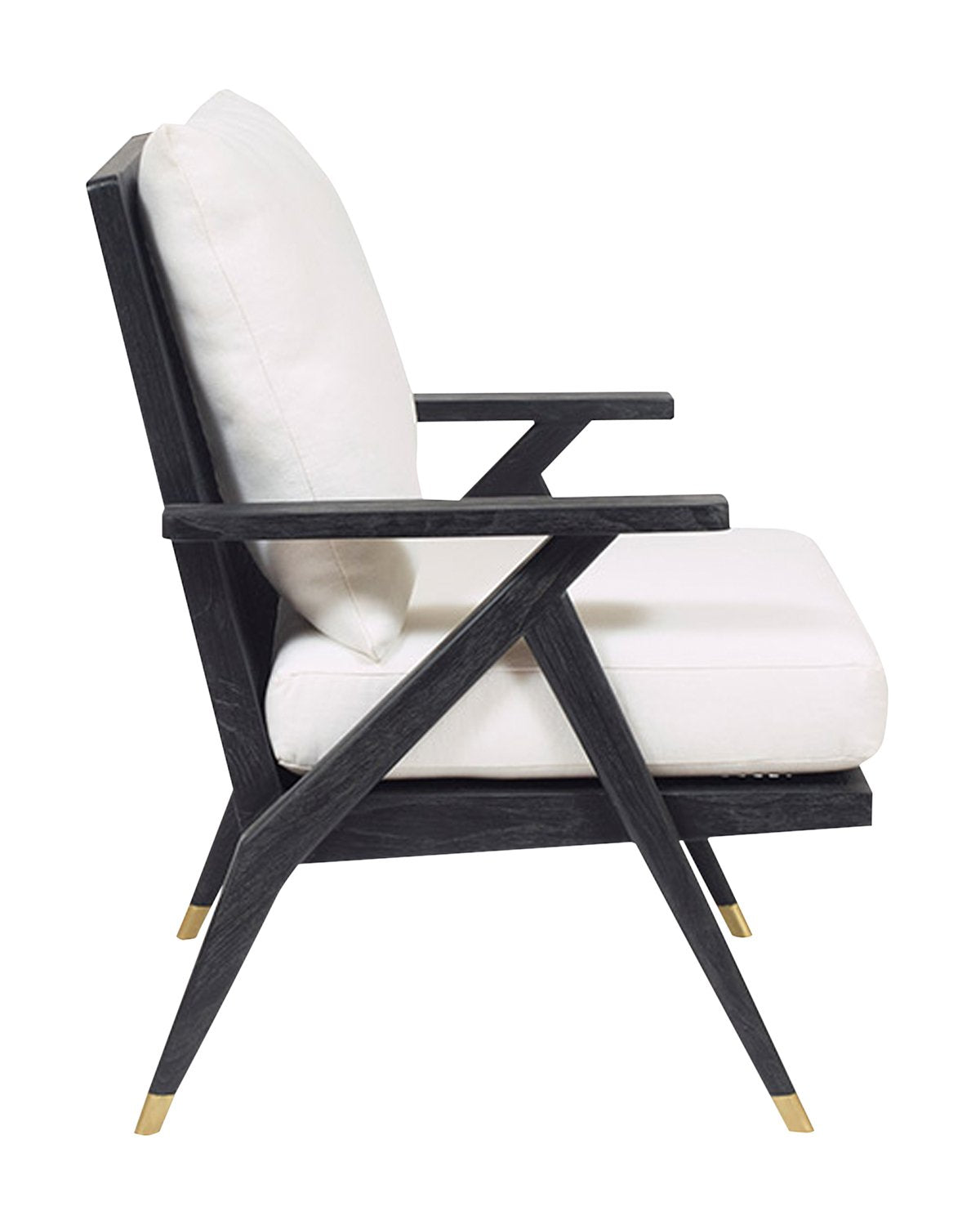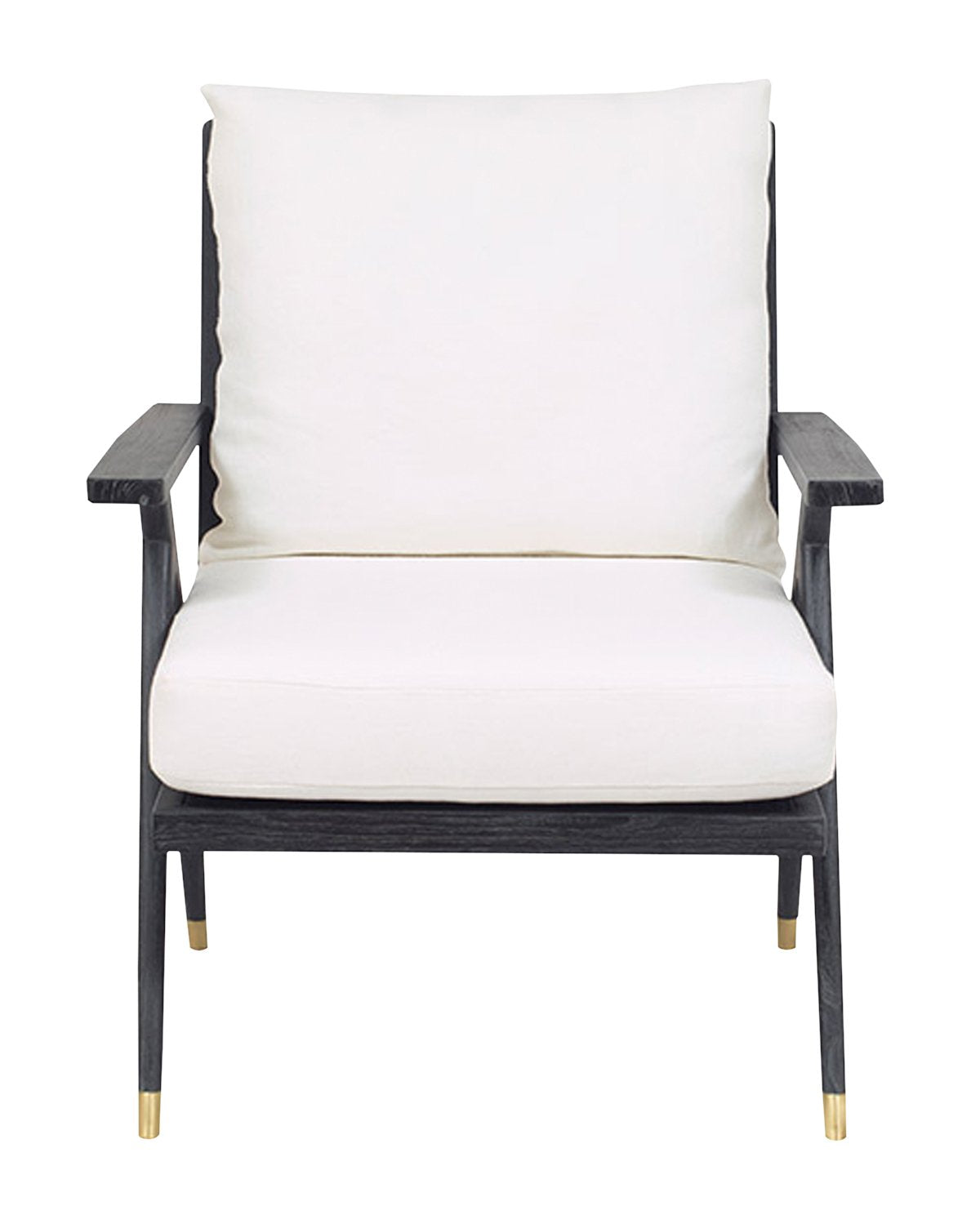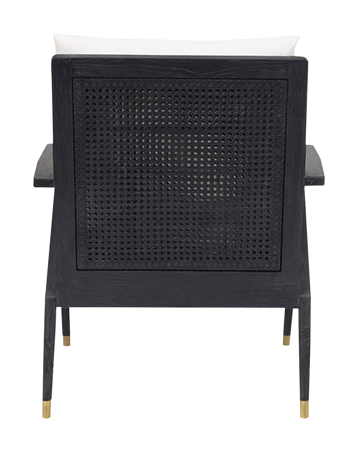 Inspired by early Hollywood-era furniture, our Maira Chair features cane and wood construction. Its simple, airy look plays off the deep onyx contrast against sophisticated white cushions. With a durable performance fabric and brass accented legs this chair lends both style and function to your space.